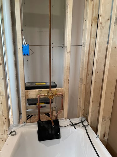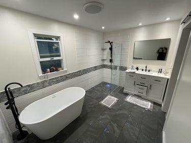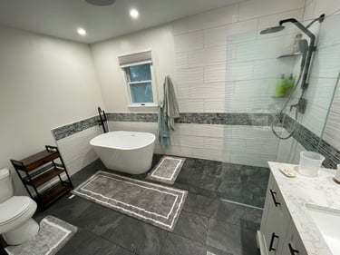 Custom curbless shower with Schluter waterproofing throughout master bathroom; standing soaking tub; overhead shower head; new vanity with soft close doors and drawer